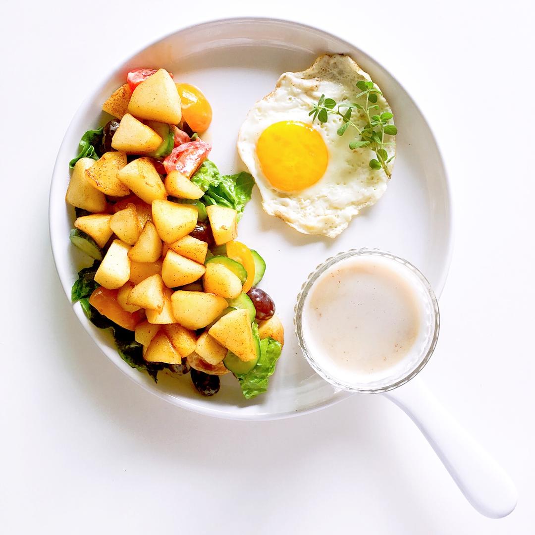 小长假第一天,睡到自然醒了才慢吞吞地做早餐吃。椰子油煎苹果沙拉,煎蛋,鹰嘴豆豆浆(加了红枣和巴旦木)。 #早餐•2017...