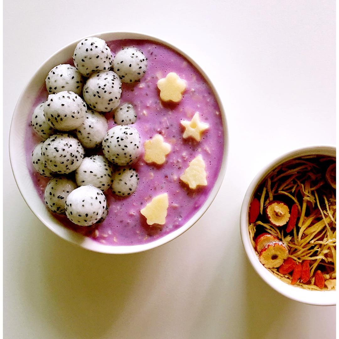 紫薯隔夜燕麦,花青素满满的,里面加了奇亚籽和蔓越莓,topping有香蕉奇异果苹果和椰子脆片,吃起来软糯香甜、口感丰富,...