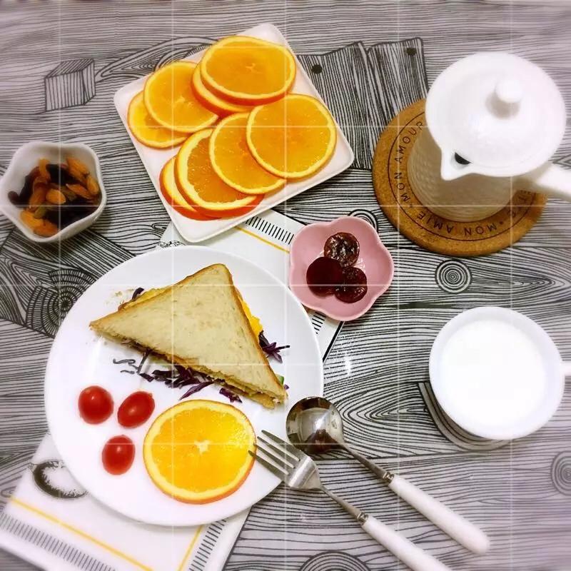 三明治+金钱肉+坚果+鲜橙+牛奶