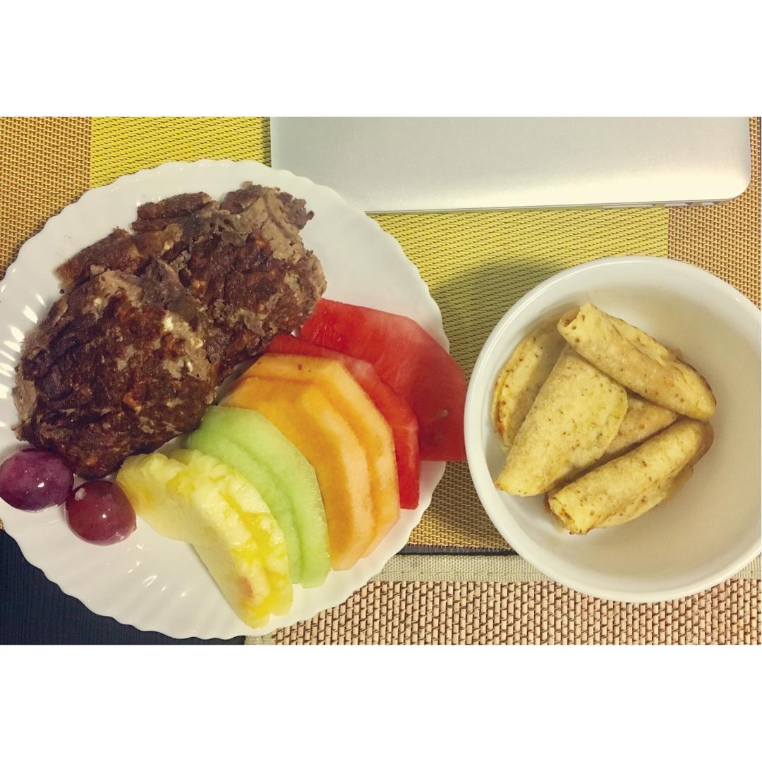Day 2⃣️ chocolate protein pancake + mini taco + mixed fruits...