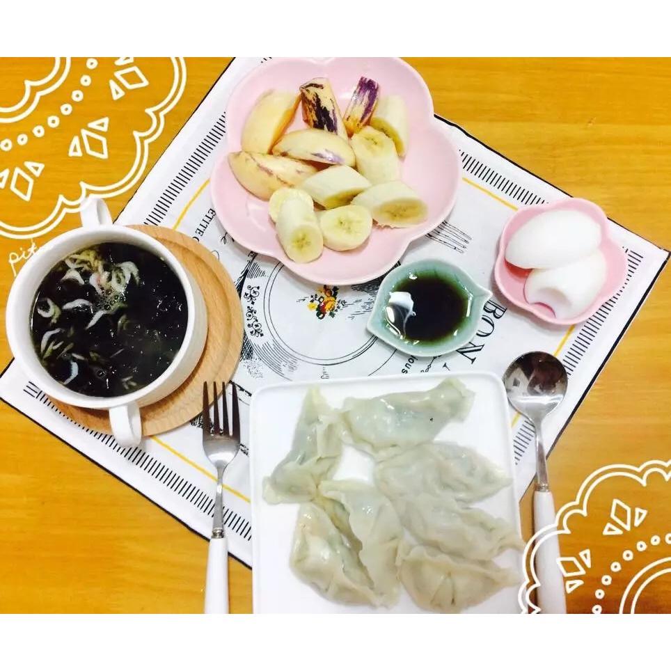水饺+虾皮紫菜汤+人参果香蕉+水煮蛋
