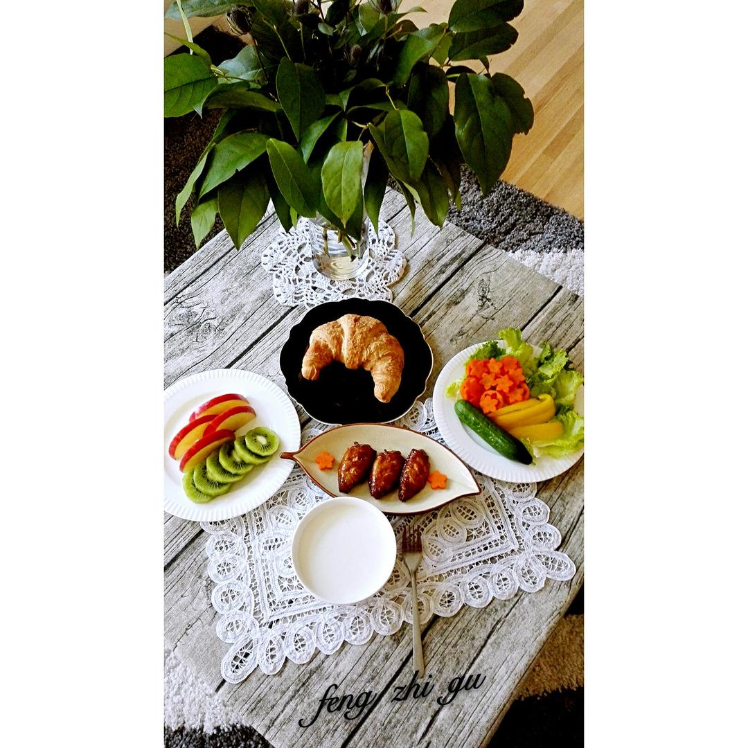 枫糖烤翅+蔬果+牛角面包(外购)、牛奶, 鸡翅入味一夜,带着特殊的枫糖香气,觉得是最好吃的一...