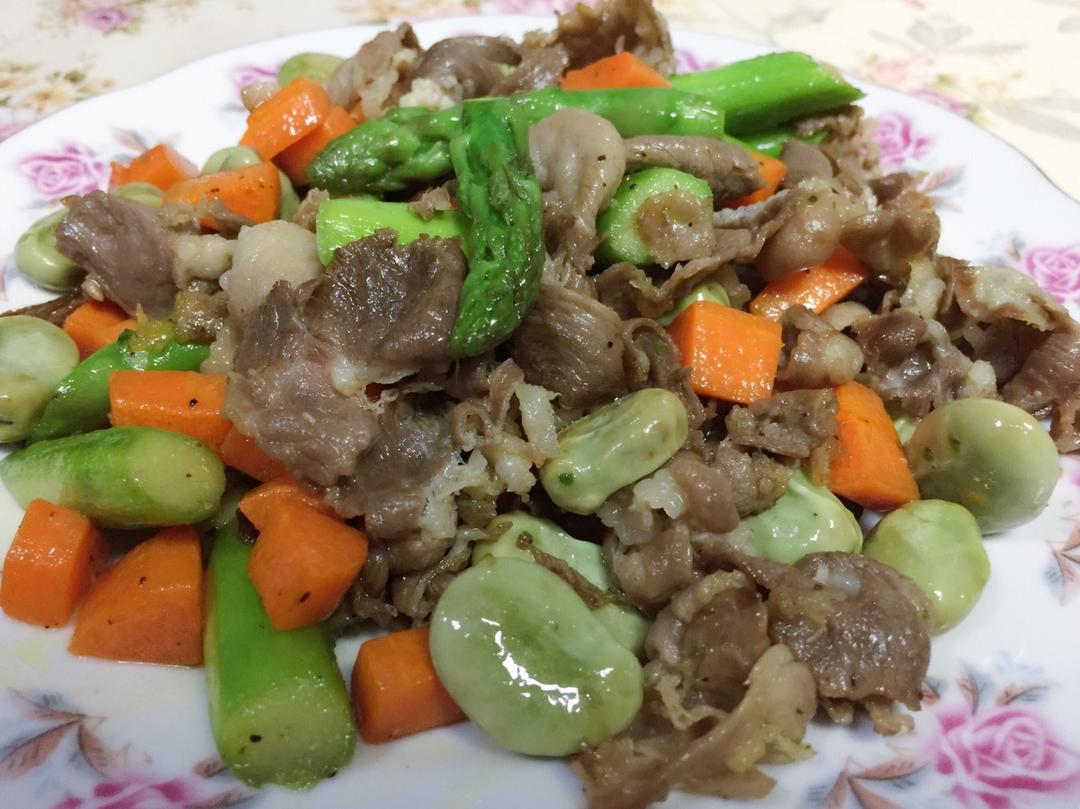 170505立夏日晚间出品,芦笋胡萝卜爆炒肥羊片,又加了蚕豆,简单美味。