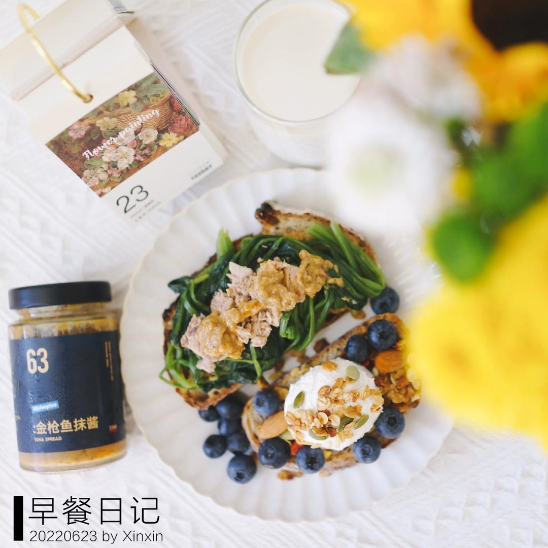 用TBS的酸面包切片做开放式,菠菜与金枪鱼完美融合。厚酸奶是近期自己...