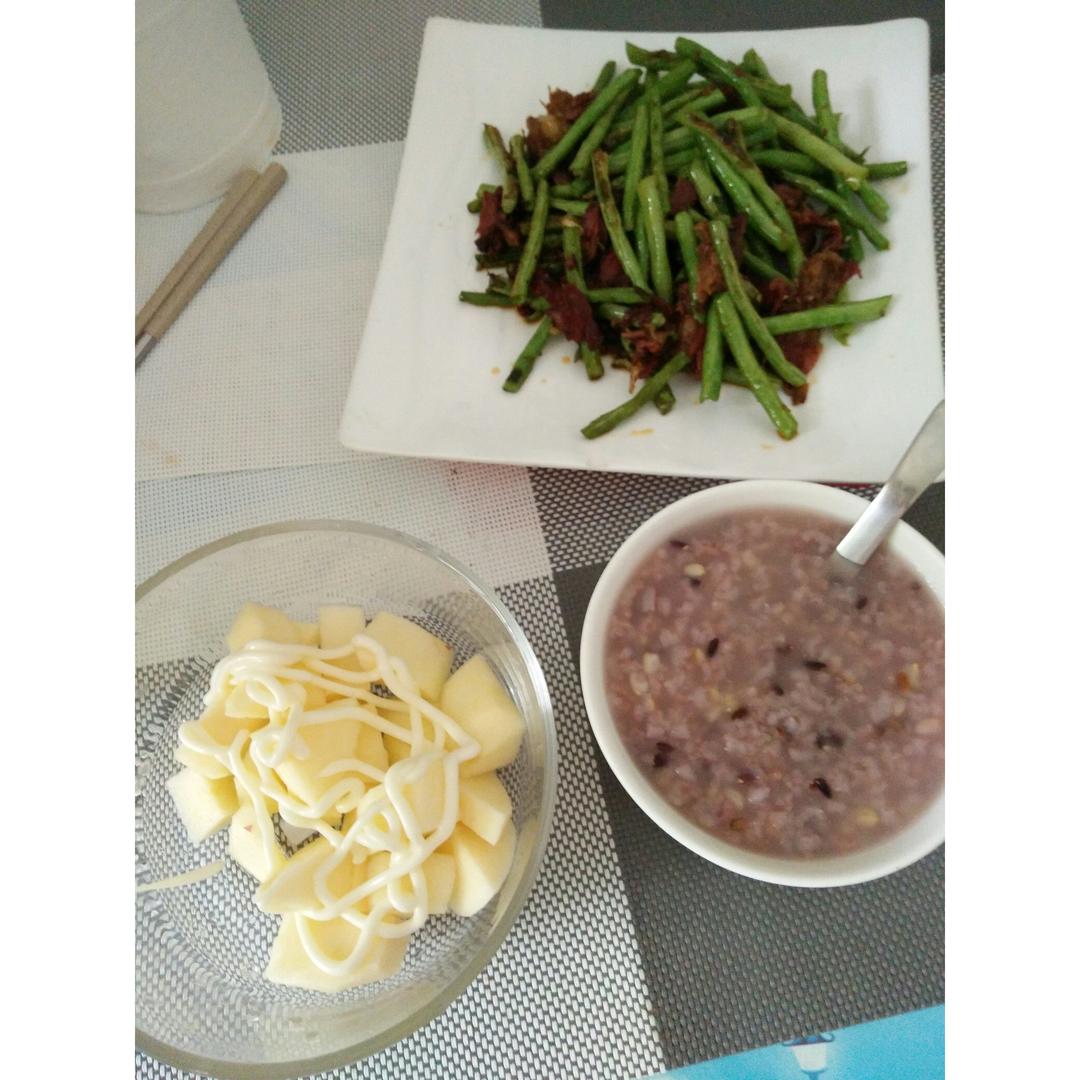 迷迭香炖肉、白水豆角配杂粮饭。