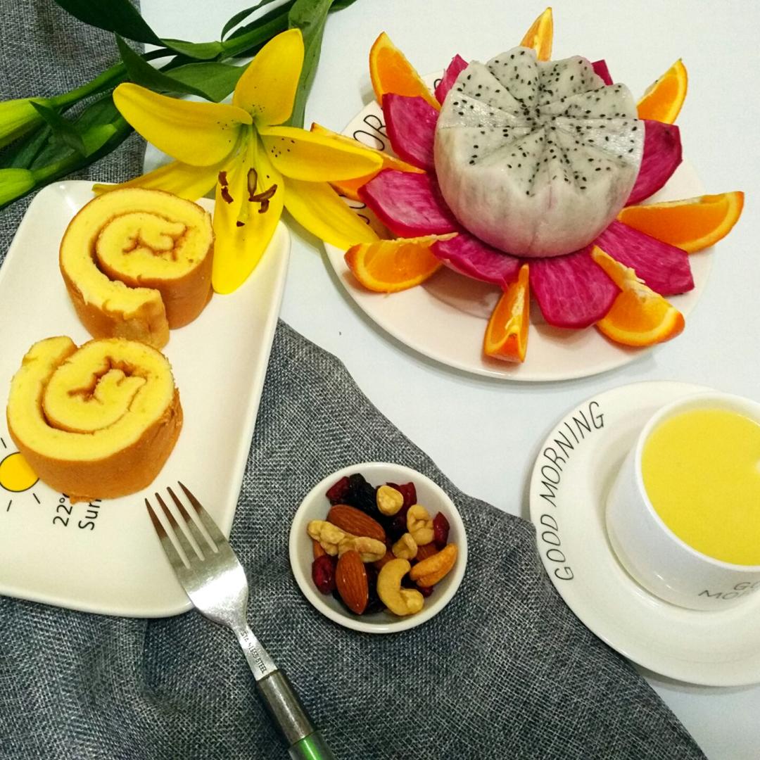 早餐,蛋卷,火龙果,鲜玉米糊,每日坚果!