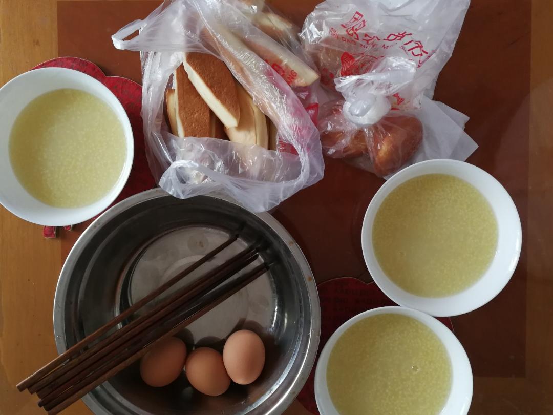 小米粥,喜饼,油炸糕,老蛋糕,鸡蛋。