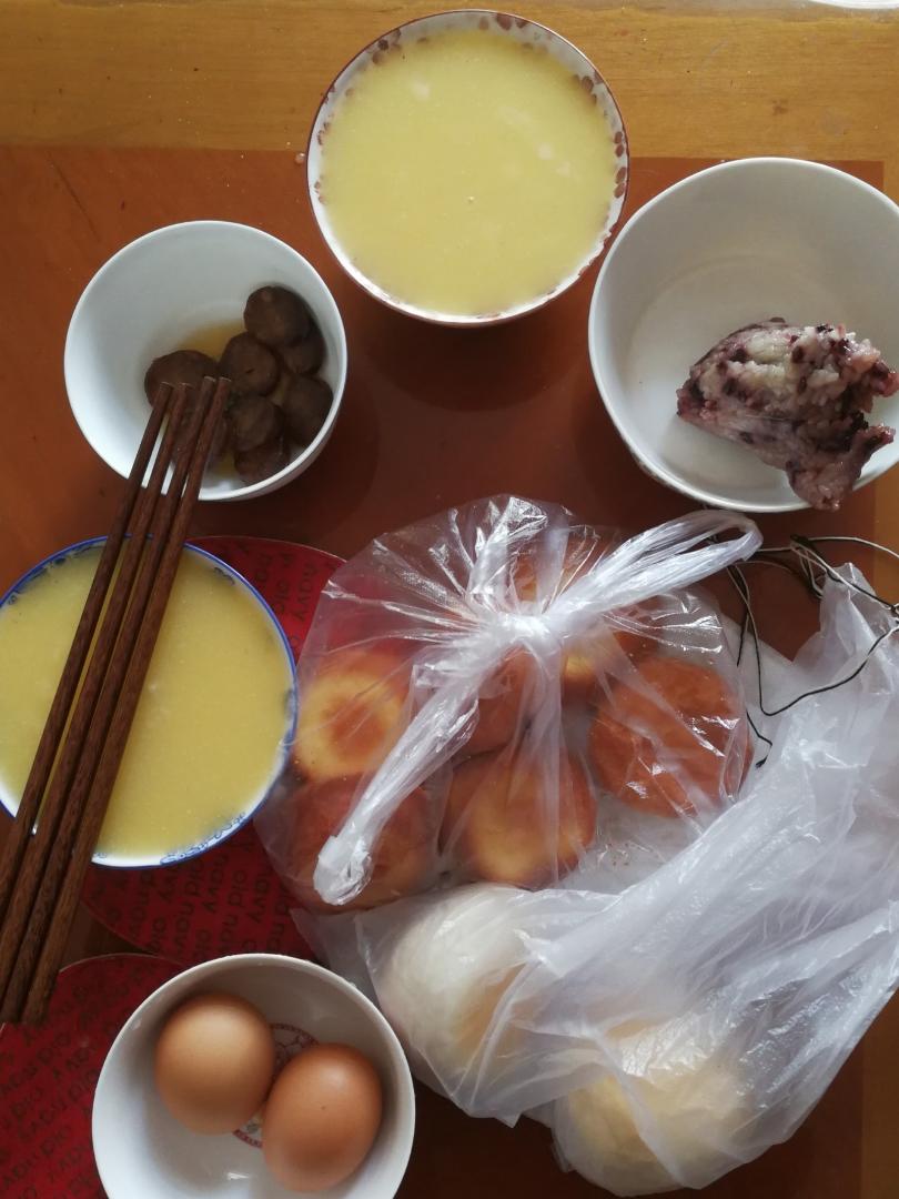 黑米豆沙粽子,腊肠,老蛋糕,白面包,鸡蛋,玉米面糊糊😍😍