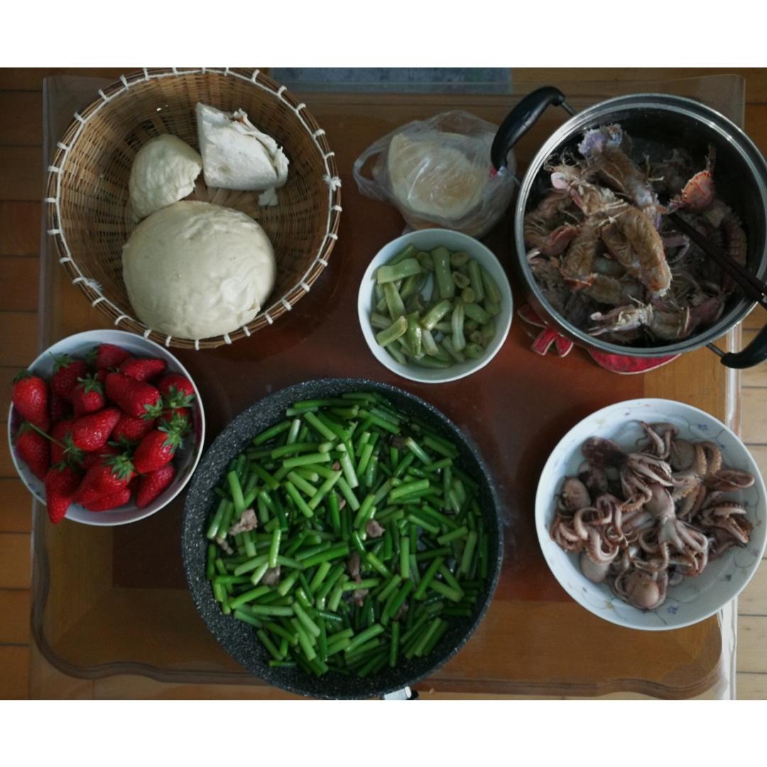 蒜薹炒肉,芸豆炒肉,八带鮹,水煮虾虎,火烧,馒头,草莓🍓!