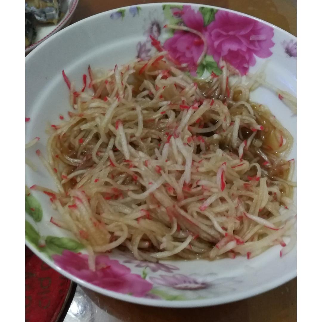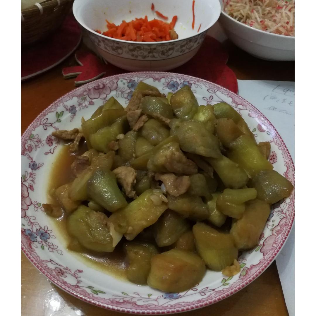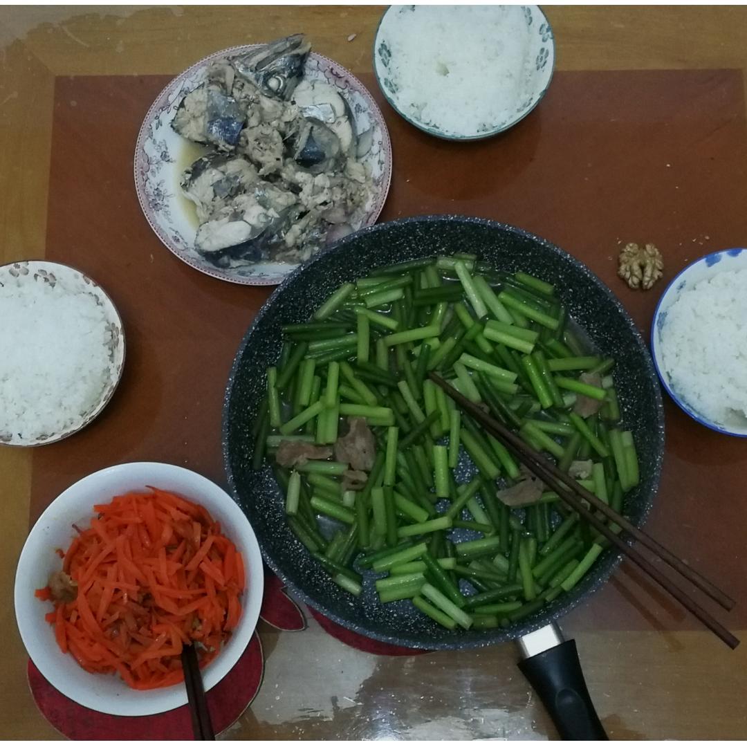 炖鲅鱼,蒜薹炒肉,胡萝卜炒肉,五常大米饭。吃两碗!
