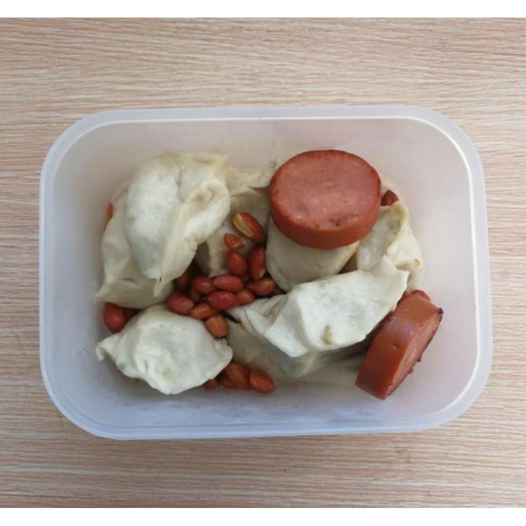 韭菜猪肉烫面大饺子,麻辣花生,香肠。