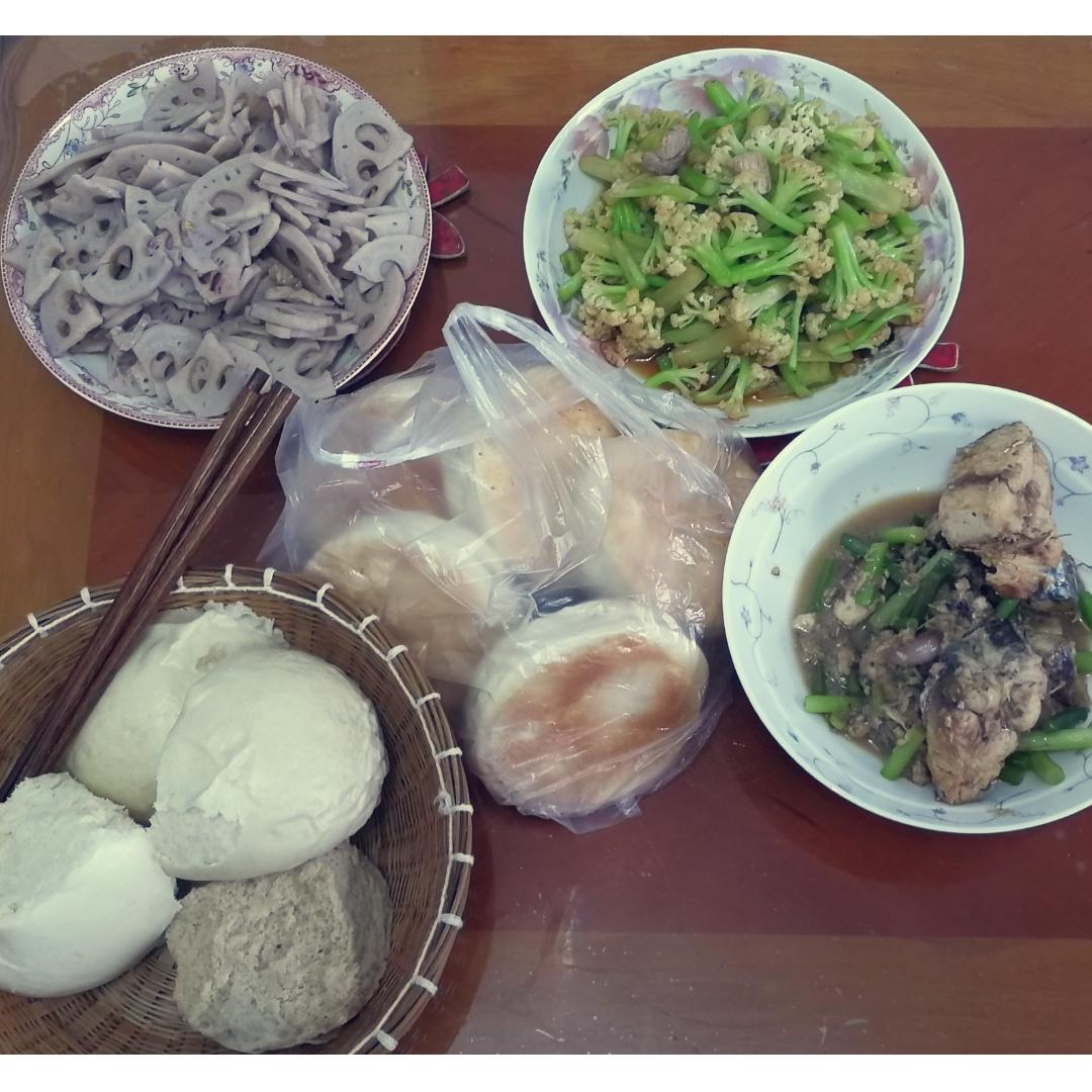 辣炒莲藕猪肉,有机菜花炒肉,蒜薹炖鲅鱼,馒头,老爸买的火烧~