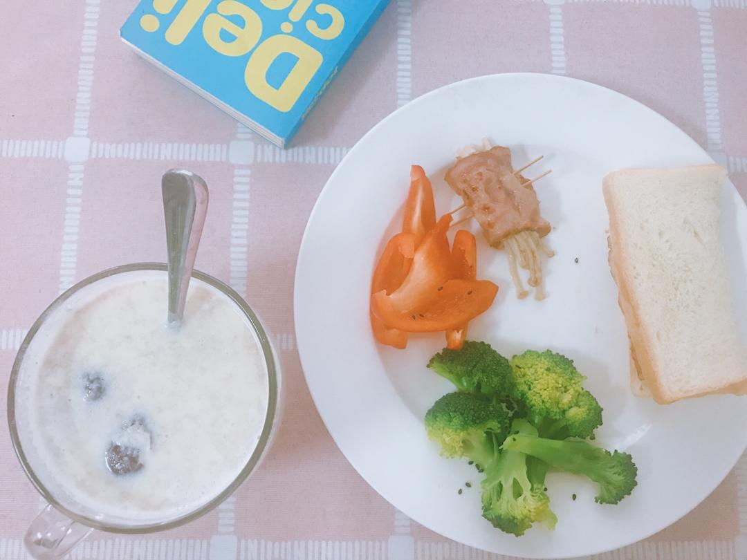 今日早餐❤️姜汁撞奶+西兰花+一块吐司+红菜椒+培根金针菇