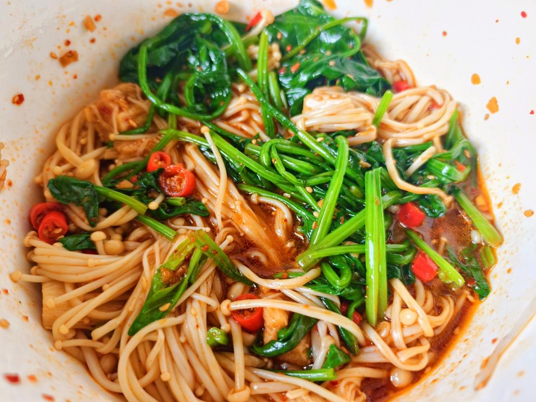 鲜亮的料汁裹着每根金针菇,脆嫩的菠菜与小米椒碰撞