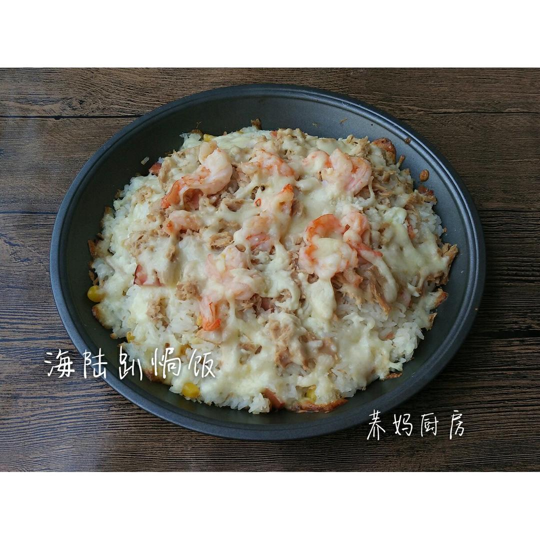 把中午剩下的饭、玉米粒、肉片、虾、吞拿鱼、蛋白、芝士,全部烩成一盘香喷喷的焗饭,简...