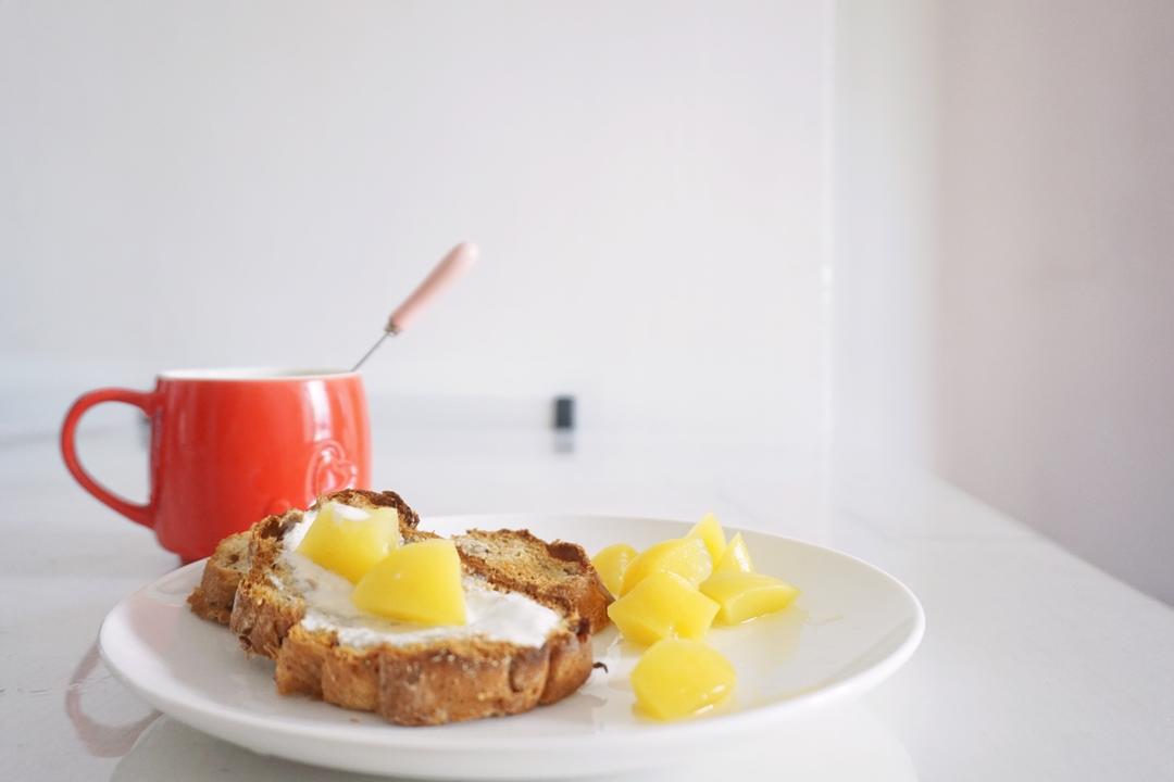 简单地把剩下的面包切了片,把剩下的自制酸奶抹了吃,外加一块黄桃,喝了一杯蜂蜜水 #早餐•2...