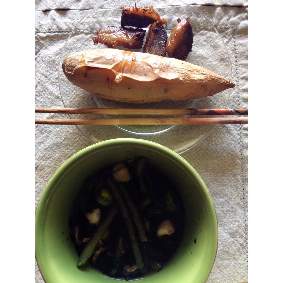 蔬菜瑶柱海米汤、烤地瓜和烤牛肉干,肥的部分好香滑!只有我吃肥的,小的时候把肥的都给我妈,长大后突然有一天觉得对她不公平,...