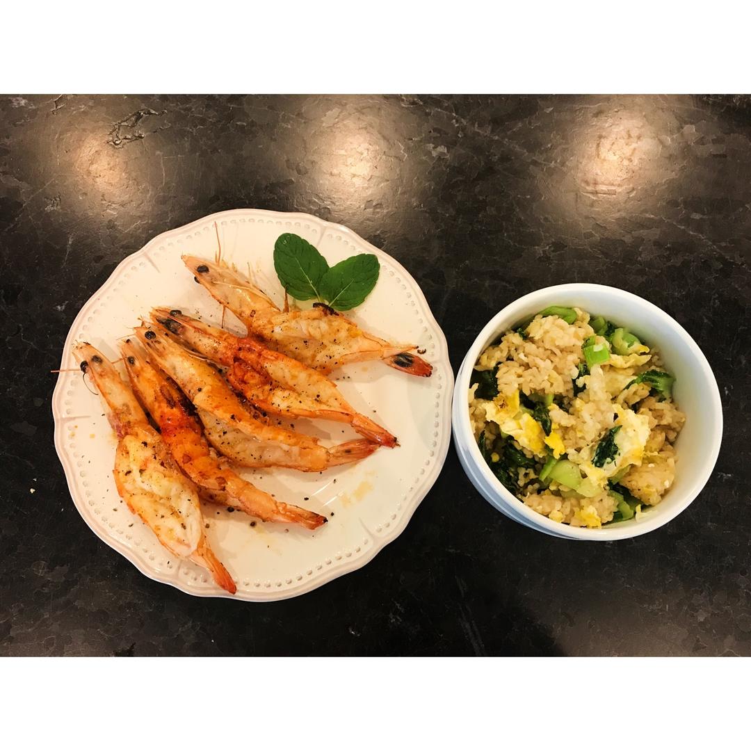 很多天没上菜了 因为我在适应新的Diet,今天中午的干煎大虾和青菜炒糙米饭 还勉强能拿得出手来。图二是门前的杜鹃花美丽的...