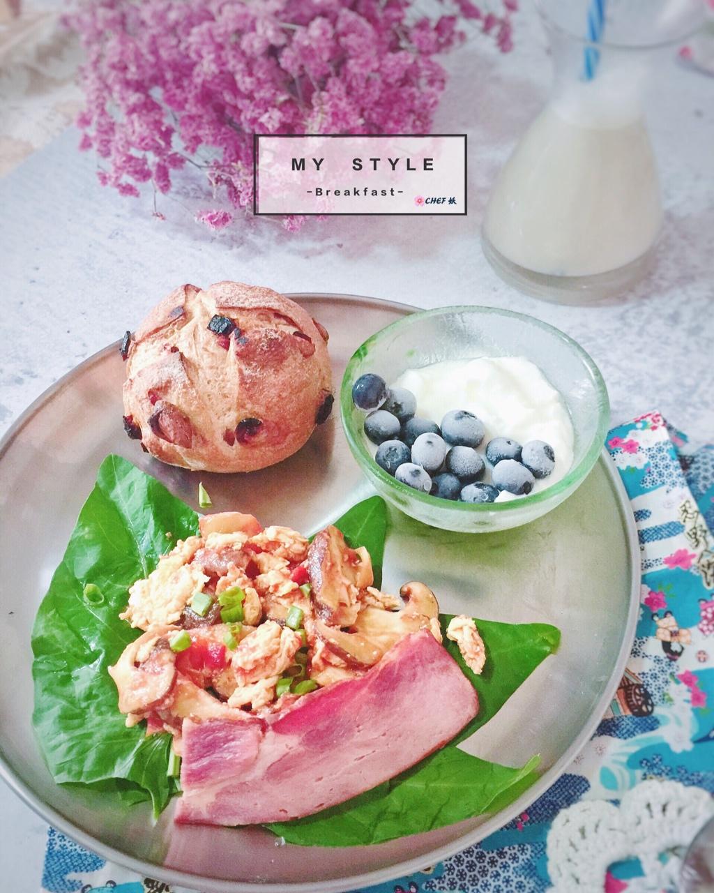 黑麦蔓越莓欧包+蓝莓酸奶+番茄🍅香菇炒蛋+黑豆豆浆。