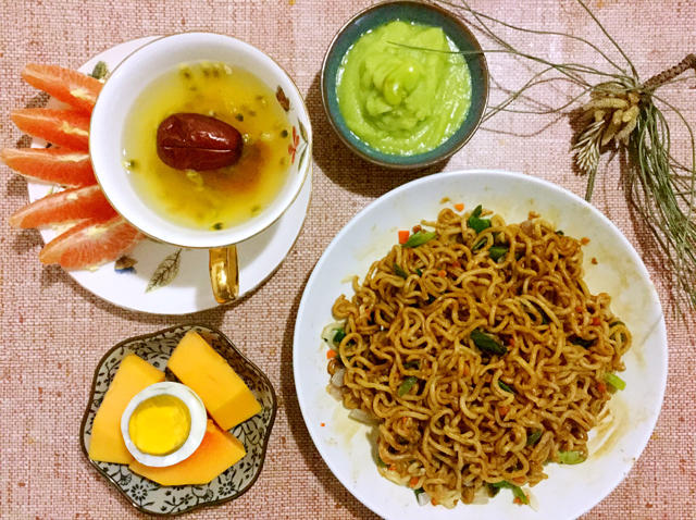NO2:杂蔬热干面+豌豆泥+水果+鸡蛋+枇杷柠檬百香果水