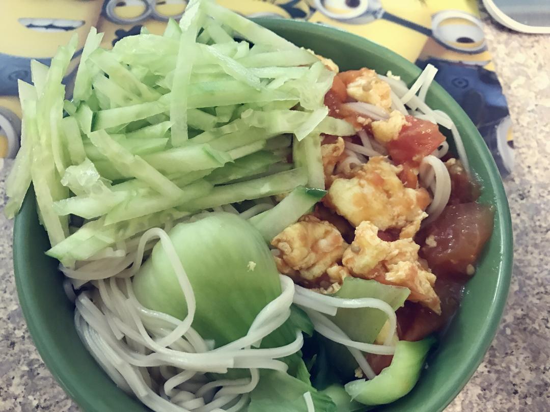 老三样。西红柿鸡蛋面,青菜,黄瓜丝。