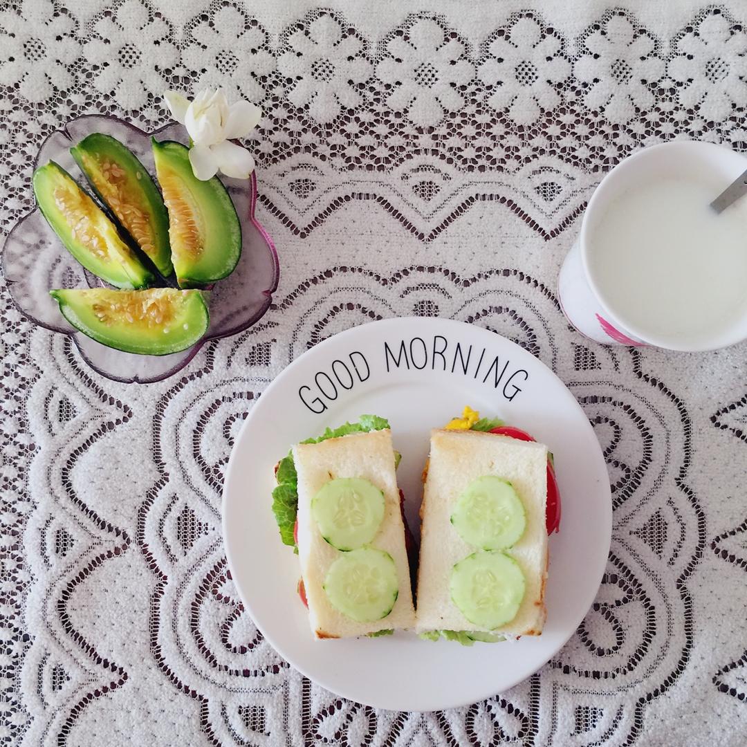 丑丑的鸡肉三明治里面有生菜、黑椒煎鸡胸肉、西红柿、黄瓜、鸡蛋,营养满分,水果香瓜和牛奶燕麦