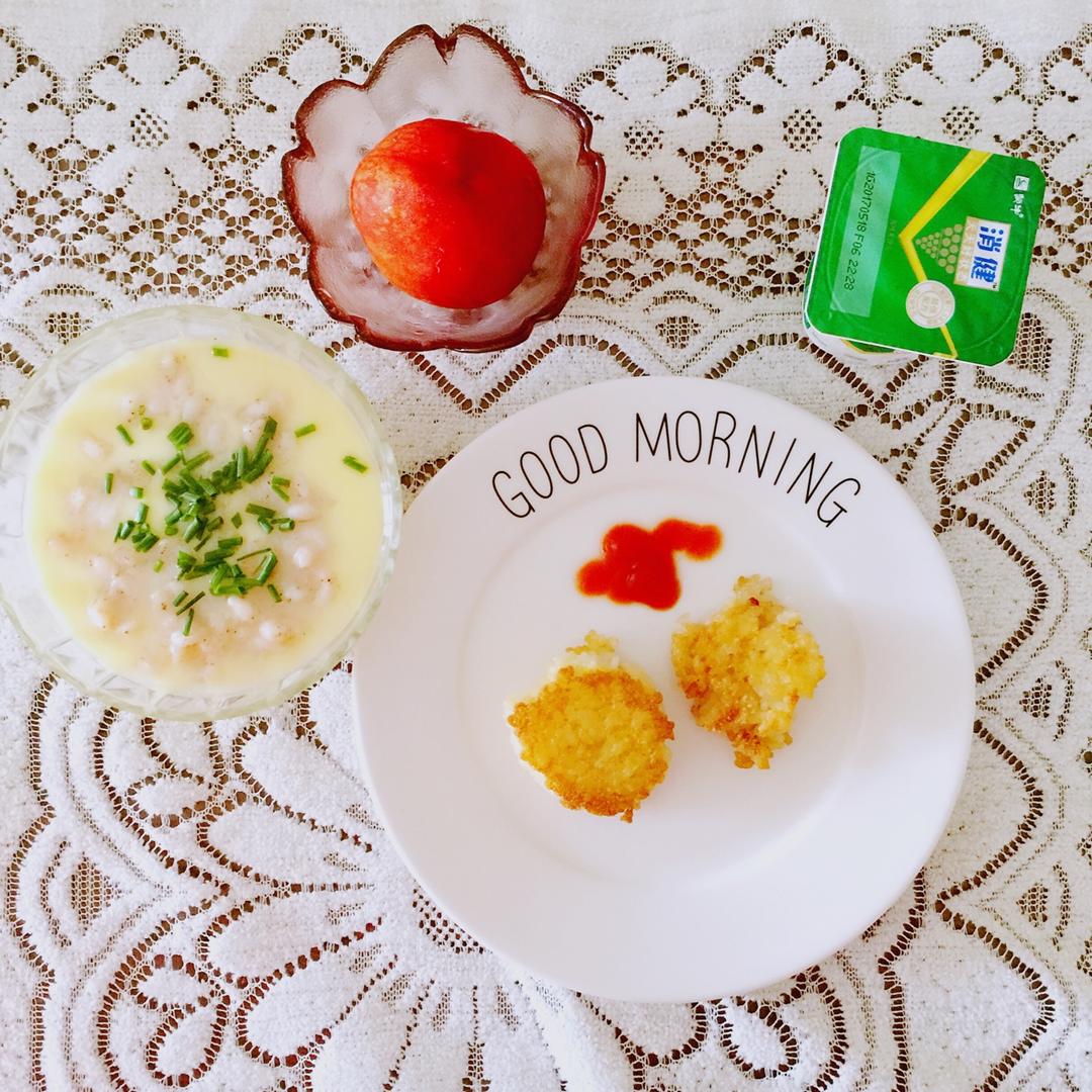 虾仁鸡蛋羹➕丑丑的煎饭团➕酸奶➕油桃