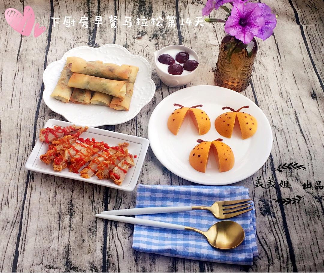 下厨房早餐马拉松第14天:老公牌香菜猪肉春卷➕空气炸锅出品的鸡排➕提子酸奶➕瓢虫橙子😄,周末万岁🍻 #早餐•2017年5...