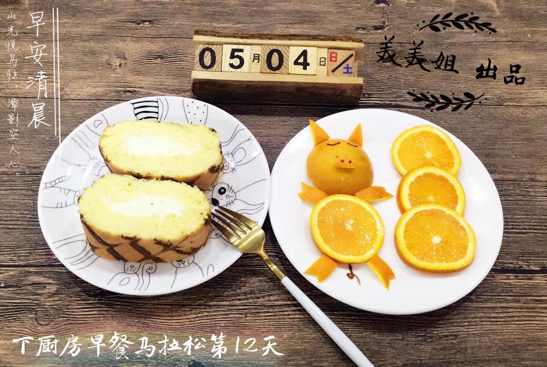 下厨房早餐马拉松第12天:自制虎皮蛋糕卷➕创意水果,外面下大雨,小伙伴们五四青年节快乐哈!👍 #早餐•2017年5月4日...