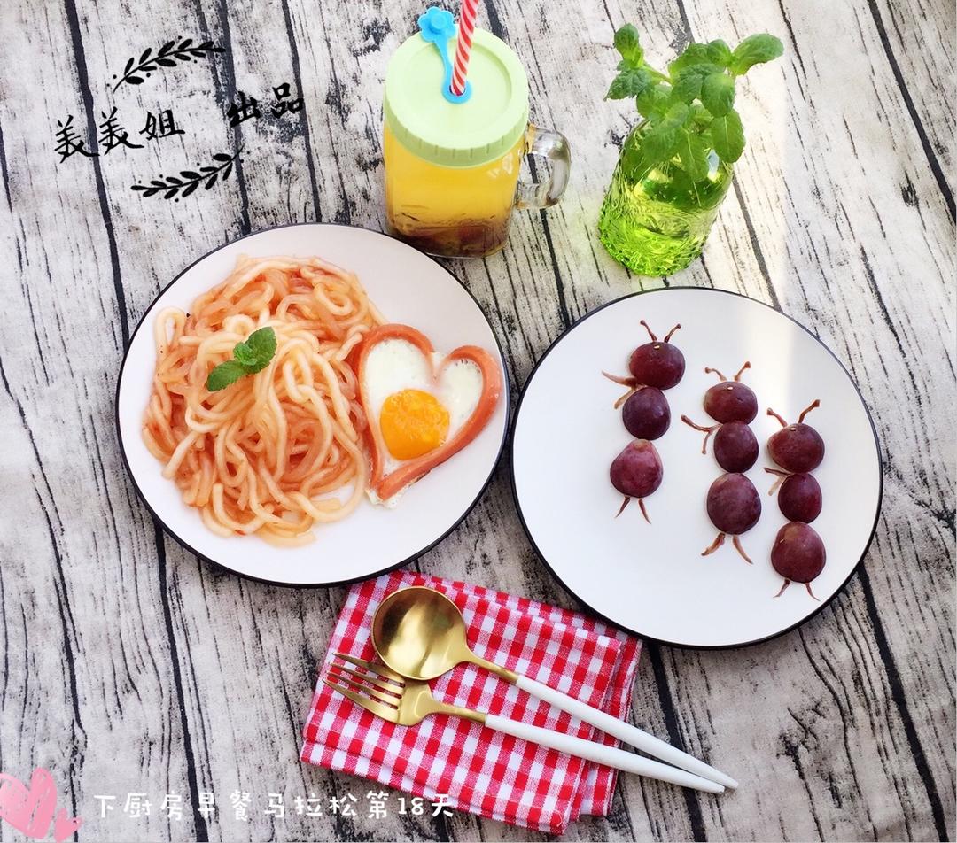 下厨房早餐马拉松第18天:自制酱拌乌冬面➕爱心煎蛋🍳➕提子🐜➕一杯百香果提子苏打水,休息天睡个懒觉吃顿美美哒早餐好满足😄...