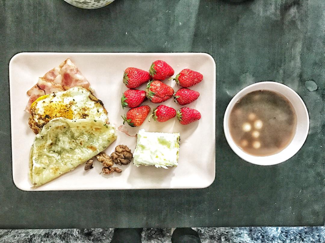 昨天做起事来忘记了,自己补打卡day4葱油饼+草莓+培根鸡蛋+红豆小圆子