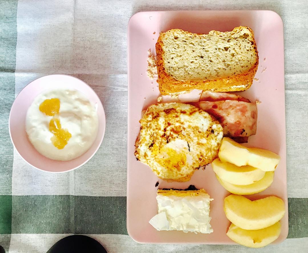 0423 day1 酸奶+肉丝夹心面包+培根+煎蛋+半个苹果+小块蛋糕