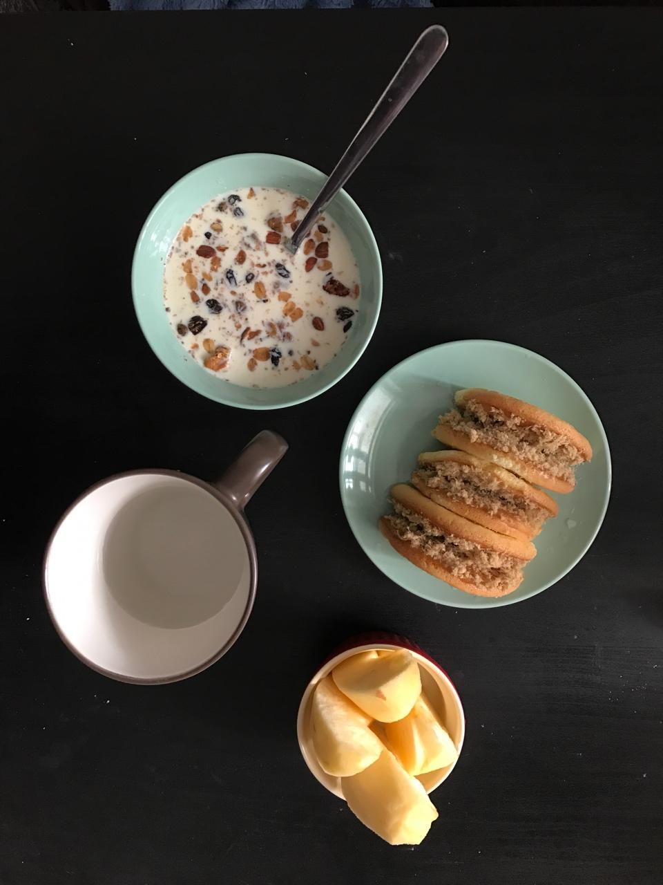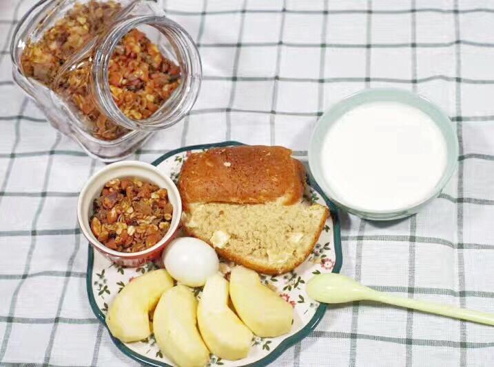 day2 葱油饼+培根煎蛋标配+酸奶+半个苹果+核桃+麻薯