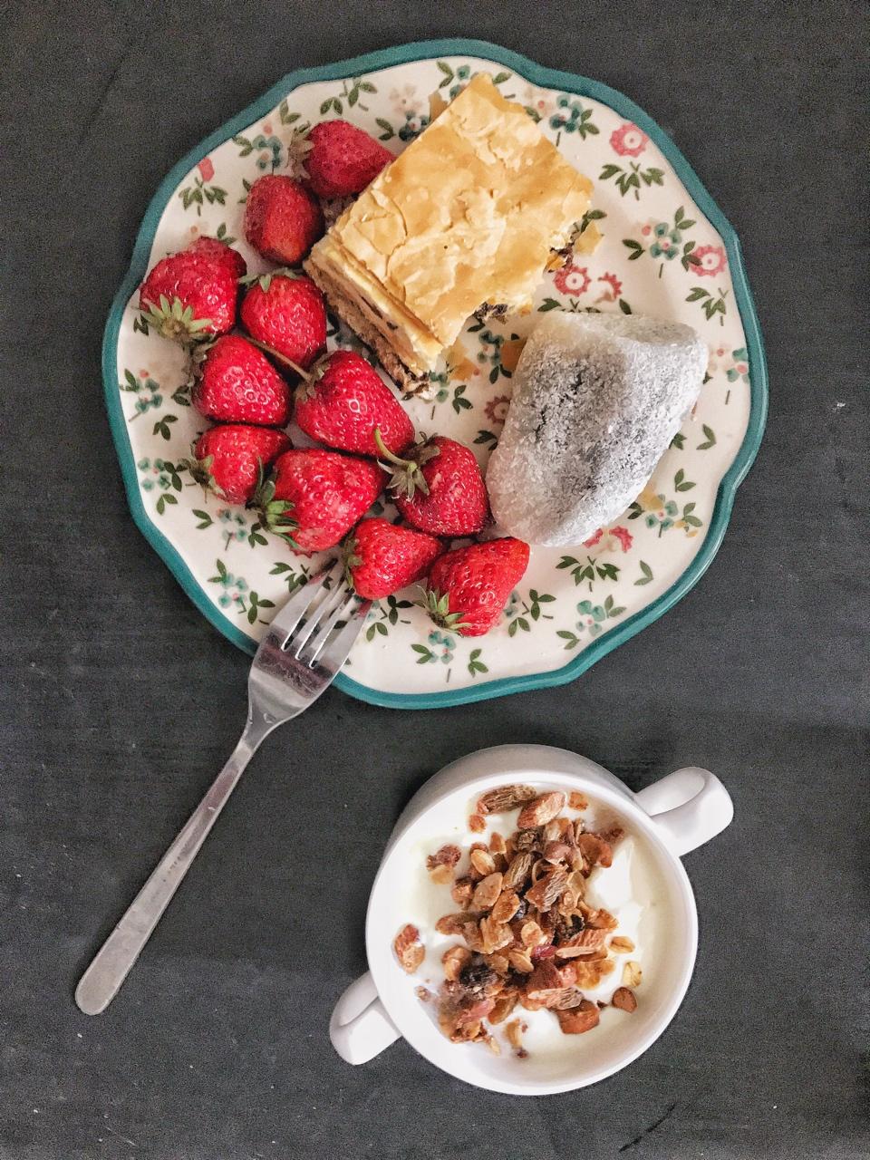 0425 day3 今天是外来点心,85度拿破仑+大富贵糕团+草莓+酸奶+自制卡乐比同款麦片 #早餐•2017年4月25...