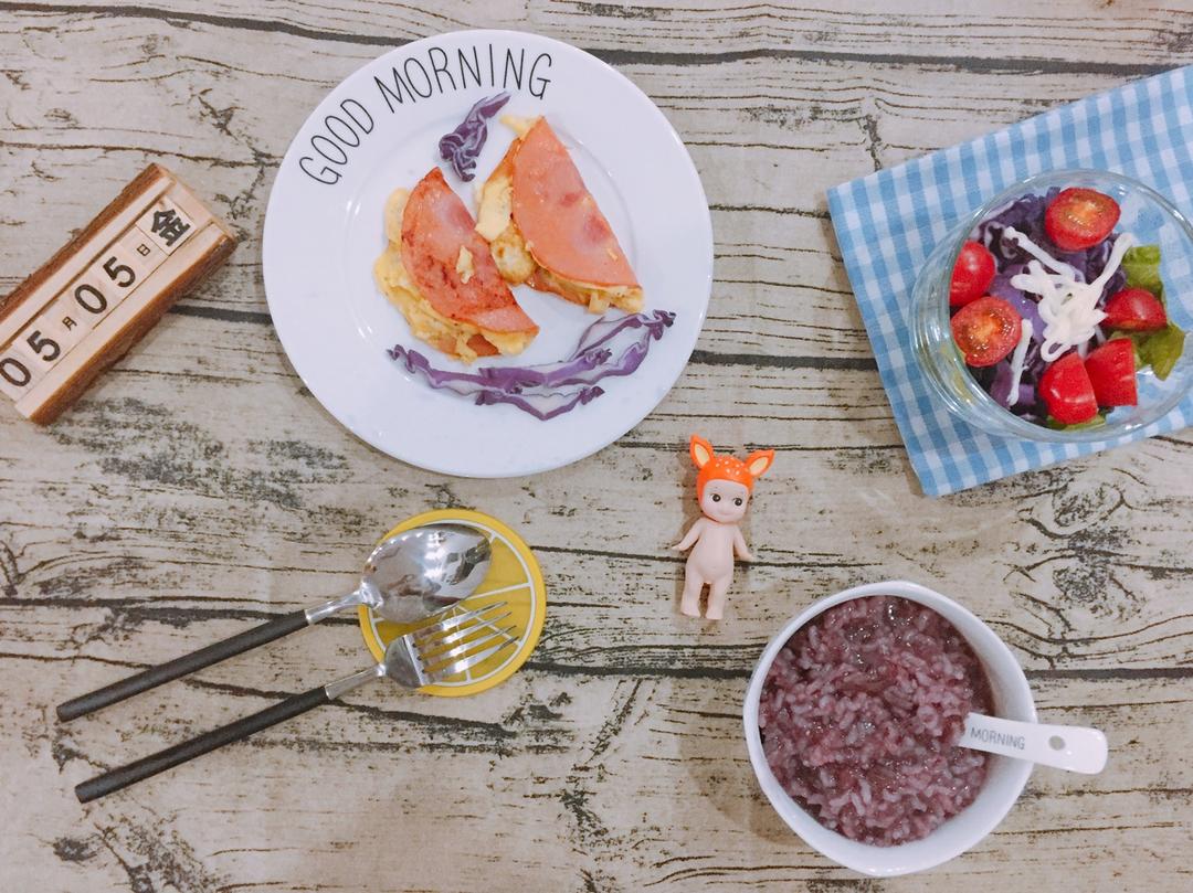 Day13 紫米粥 嫩蛋火腿片 沙拉 一人食