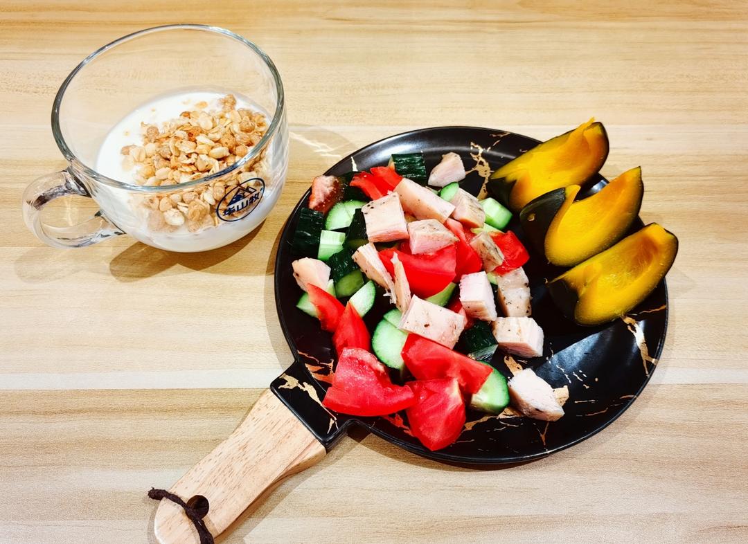 鸡胸肉蔬菜沙拉,蒸贝贝南瓜,酸奶燕麦片!