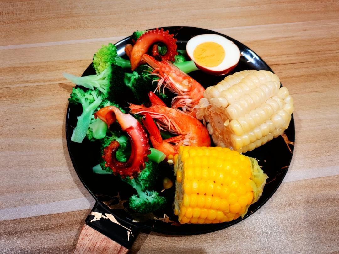 涝汁小海鲜🦐🦑白灼西兰花🥦卤蛋🥚水煮老玉米和糯玉米🌽