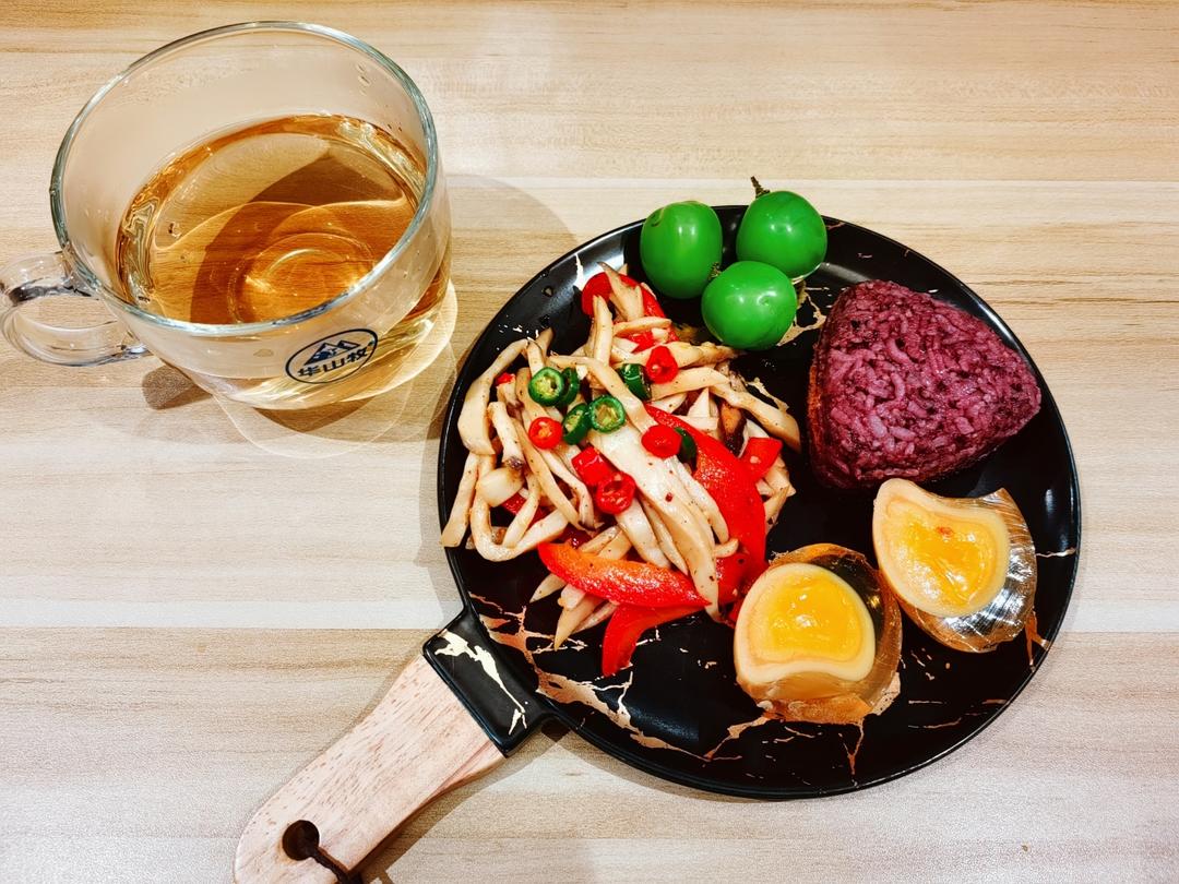凉拌杏鲍菇,黄金皮蛋,肉松三角饭团,青提,青茶🍵