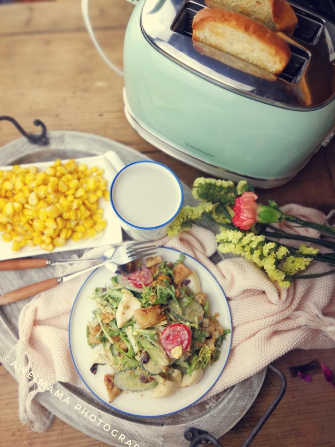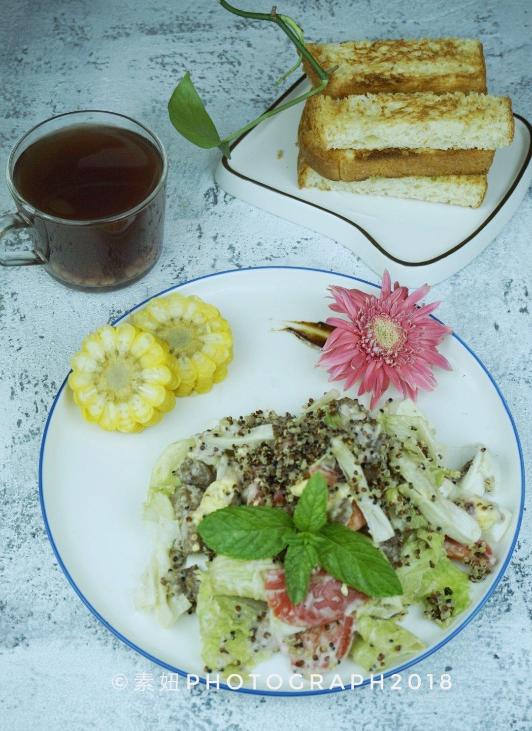 NO62:藜麦黑胡椒牛排沙拉、烤吐司、红豆薏米水