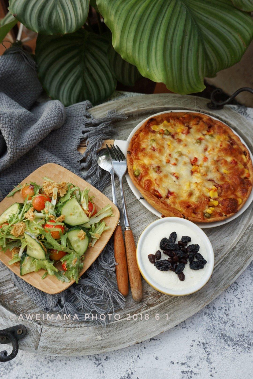 培根薄底披萨、沙拉、双皮奶