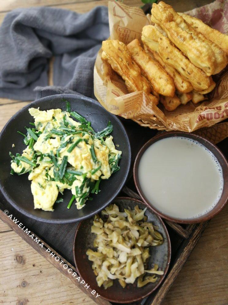 茴香油条、黑豆浆、韭菜炒鸡蛋