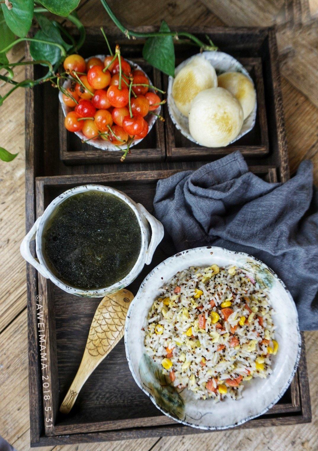 藜麦蛋炒饭、紫菜汤、奶黄包