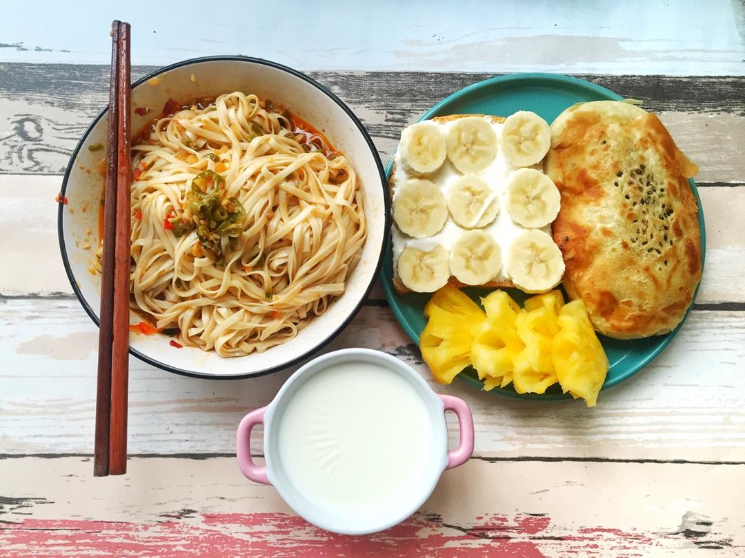 鱼汤汤面➕香蕉吐司➕红糖锅盔➕菠萝➕牛奶,亮哥吃面很开[...