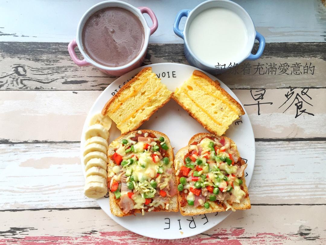 吐司披萨➕黄金起司蛋糕➕香蕉➕牛奶➕黑豆浆,一片顶饱!...