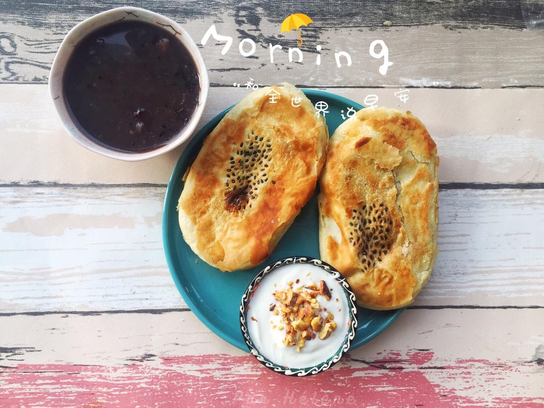 红糖锅盔➕坚果酸奶➕杂粮粥,昨天混了一天没有准备食材,今...