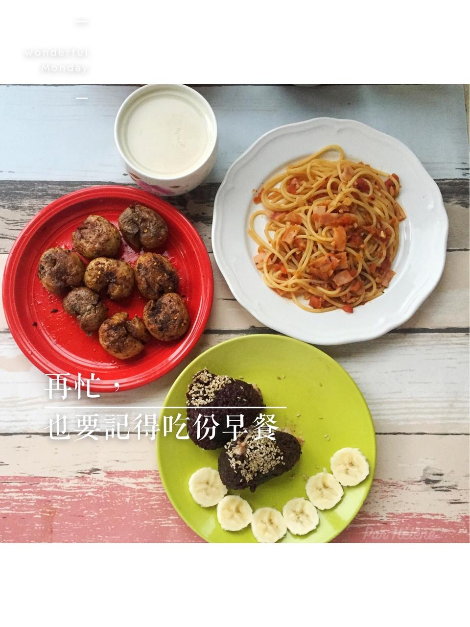 番茄意面➕紫米饭团➕剩菜煎土豆➕牛奶炖桃胶,昨天晚上没...
