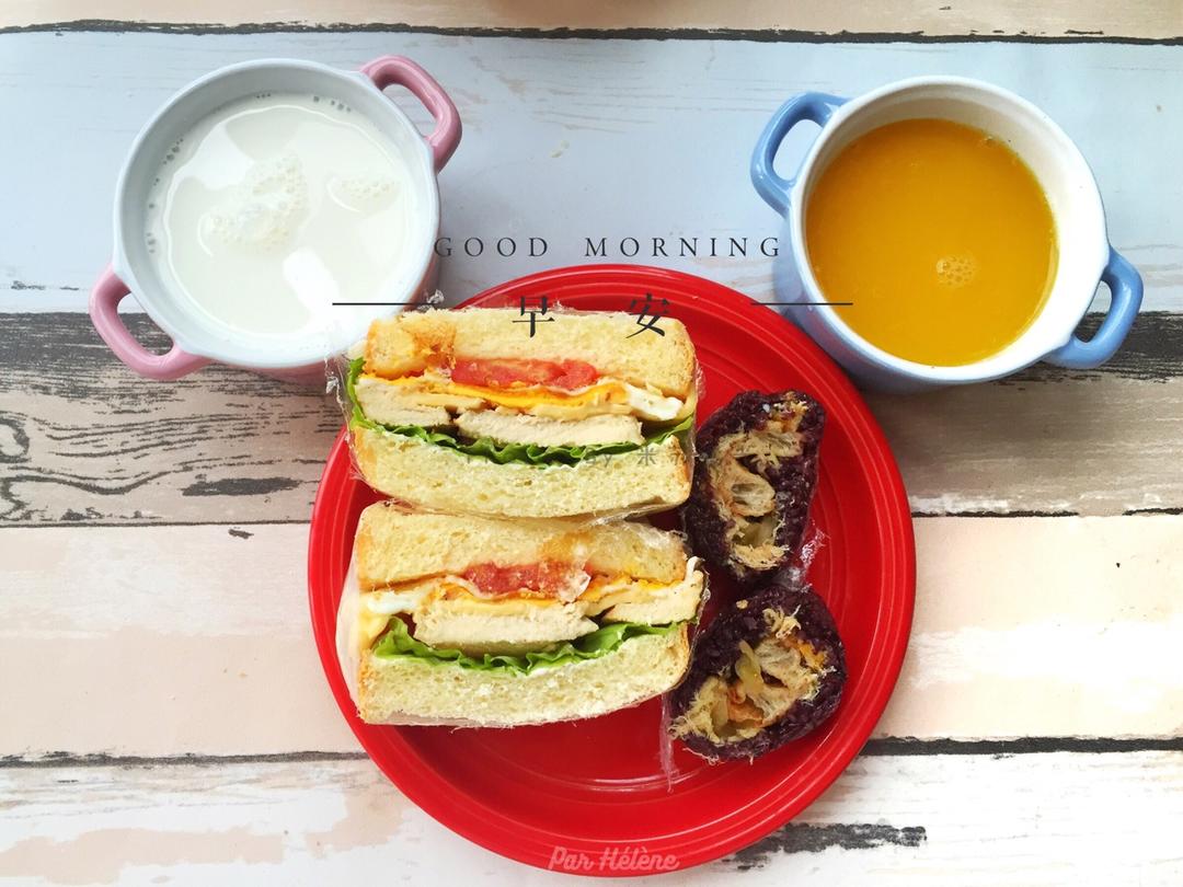 鸡肉三明治➕失败的粢饭团➕牛奶➕橙汁,猫宁2~ #早餐...