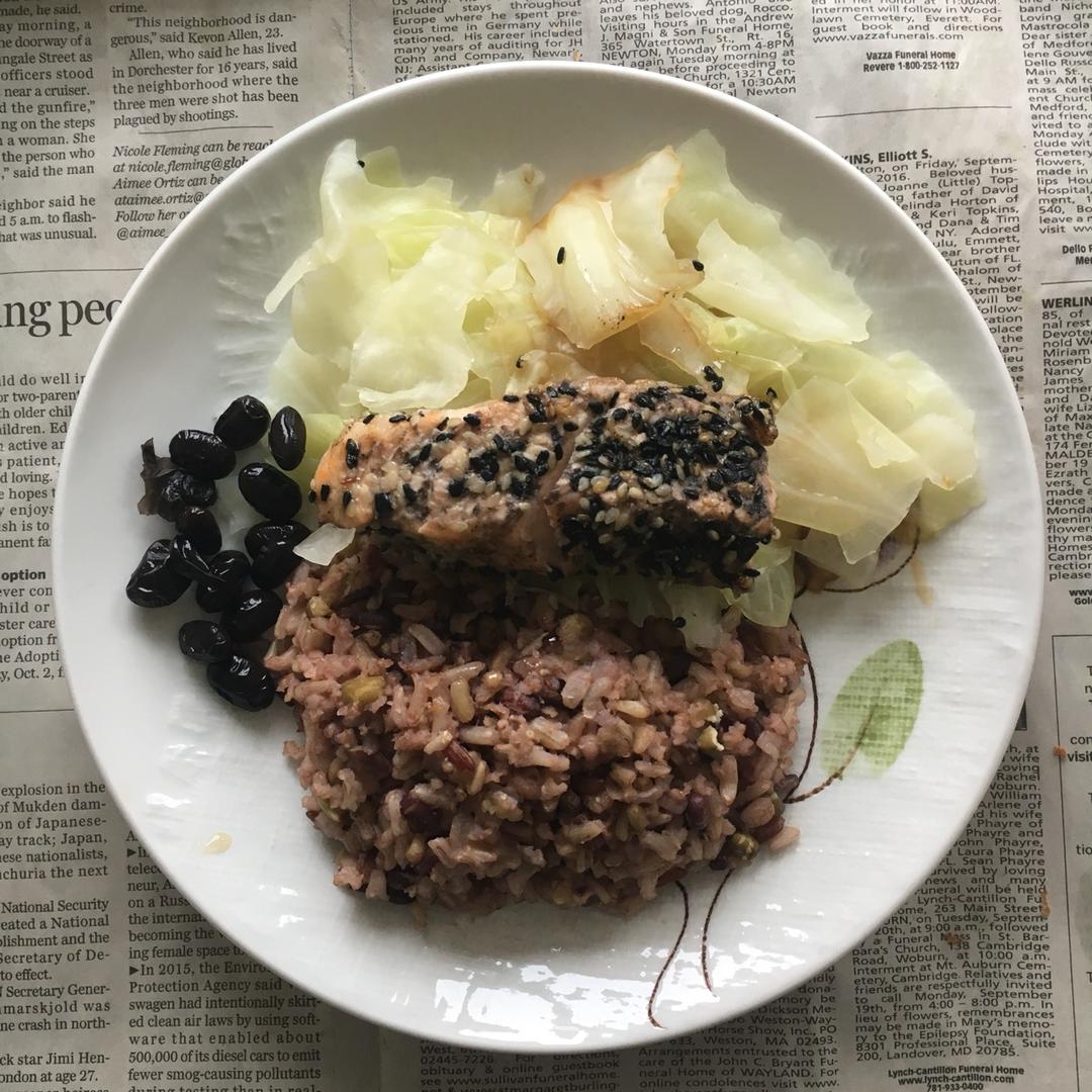 杂粮八宝饭+白灼包菜+芝麻脆皮三文鱼+酱煮黑豆。嗯非常健康。