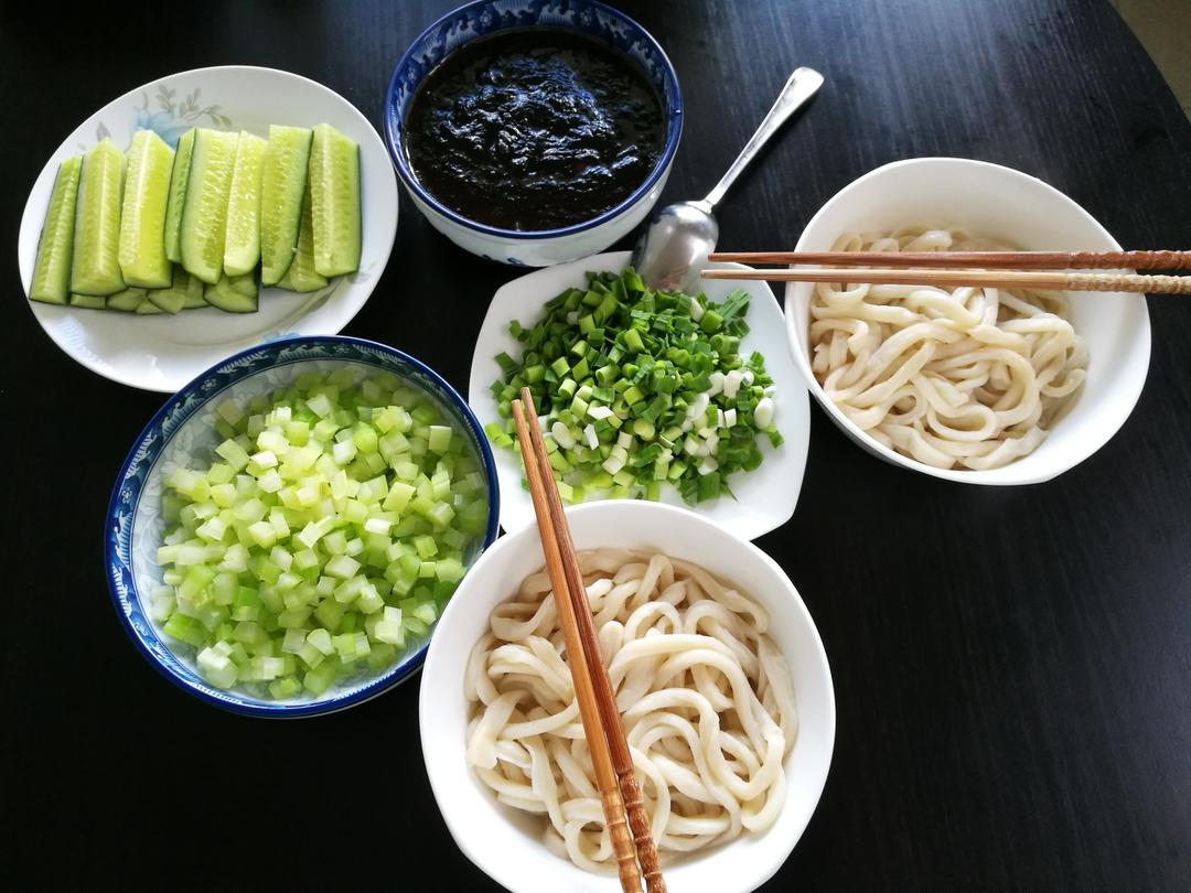 今天和的面团软硬合适,醒发的时间也好,所以抻出来的面有长度有韧劲,而且均匀😁炸酱面必须有青...