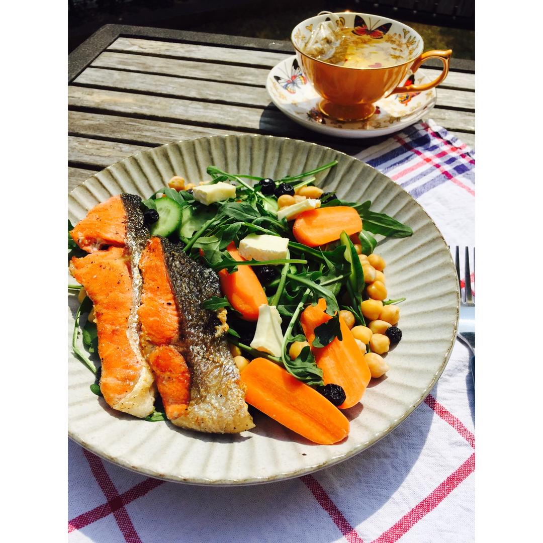 低脂高蛋白健身午餐:香煎三文鱼鹰嘴豆水果胡萝卜芝麻叶搭配芝士和蓝莓干,酱料是油醋柠檬汁